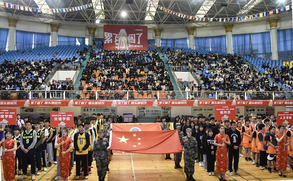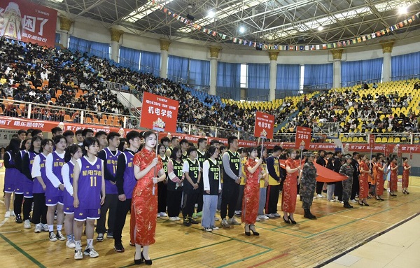 本网讯(通讯员 赵红深 摄影 李建华)为丰富学校的课余生活,提高大学生的综合素质,推动校园篮球在我校的蓬勃开展,营造良好的校园文化氛围, 4月7日下午,我校2021“东鹏杯”院际篮球联赛开幕式在体育馆篮球场举行。执行校长刘杰,常务副校长彭文武,党委副书记李先聪,纪委书记刘毅,副校长黄名文、杨兵初、罗迎社、吴义虎,东鹏集团代表,学工处、公共基础课部领导,各二级学院书记,6个二级学院代表队以及学生观众共2000余人参加了开幕式。开幕式由学生会2位文艺主持人主持。