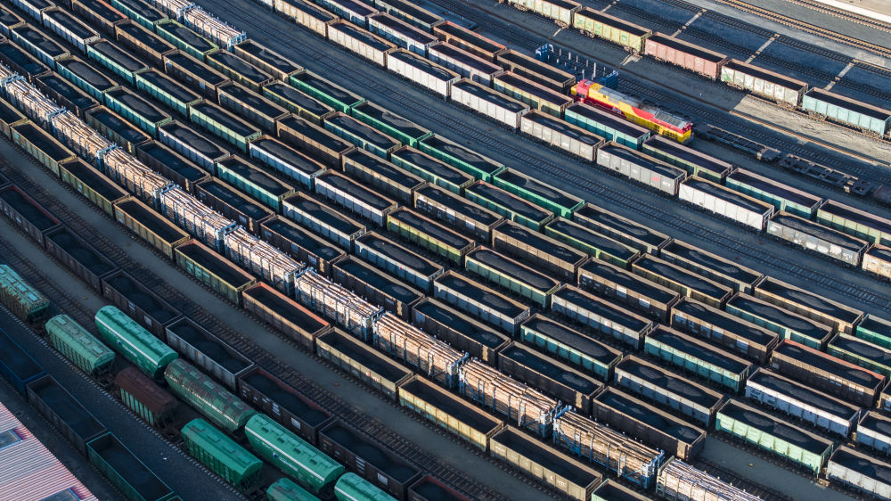 2025年10月18日,在中国铁路哈尔滨局集团有限公司绥芬河站南场,满载进口货物的列车等待解体换装(无人机照片)。